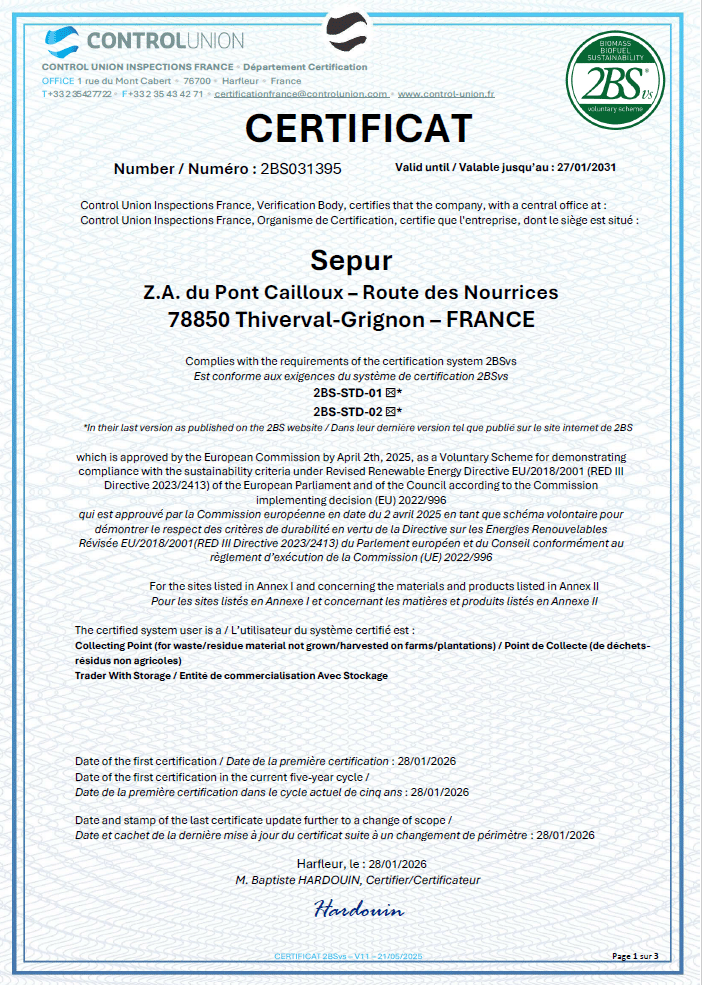 Avec cette nouvelle certification, SEPUR confirme sa volonté d’accompagner ses partenaires vers des solutions énergétiques plus responsables, de sécuriser des filières conformes aux réglementations européennes et de contribuer concrètement à la réduction de l’empreinte carbone.
